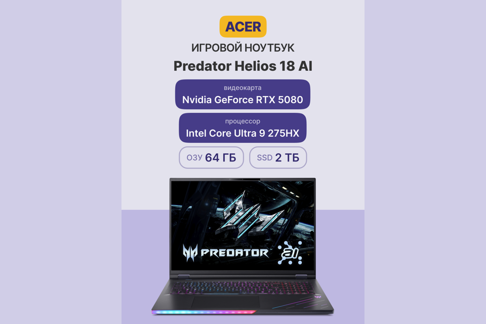 Ноутбук/ ACER Predator Helios 18 AI PH18-73-99GX 18"(2560x1600 miniLED (матовый, 240Hz, 3ms) )/Intel Core Ultra 9 275HX(2.7Ghz)/65536Mb/2TbPCISSDGb/noDVD/Ext:NVIDIA GeForce RTX 5080(16384Mb)/Cam/BT/WiFi/100WHr/war 1y/3.5kg/Black/NoOS