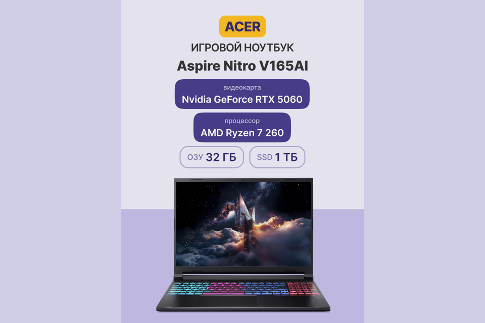 Ноутбук/ ACER Aspire Nitro V165AI ANV16S-41-R570 16"(2560x1600 (матовый) IPS)/AMD Ryzen 7 260(3.8Ghz)/32768Mb/1024PCISSDGb/noDVD/Ext:NVIDIA GeForce RTX 5060(8192Mb)/Cam/BT/WiFi/76WHr/war 1y/2.1kg/Silver/NoOS