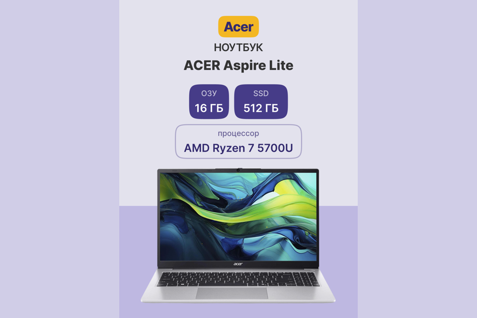 Ноутбук/ ACER Aspire Lite AL15-41P-R410 15.6"(1920x1080 (матовый) IPS)/AMD Ryzen 7 5700U(1.8Ghz)/16384Mb/512PCISSDGb/noDVD/Int:AMD Vega/Cam/BT/WiFi/50WHr/war 1y/1.5kg/Iron/NoOS