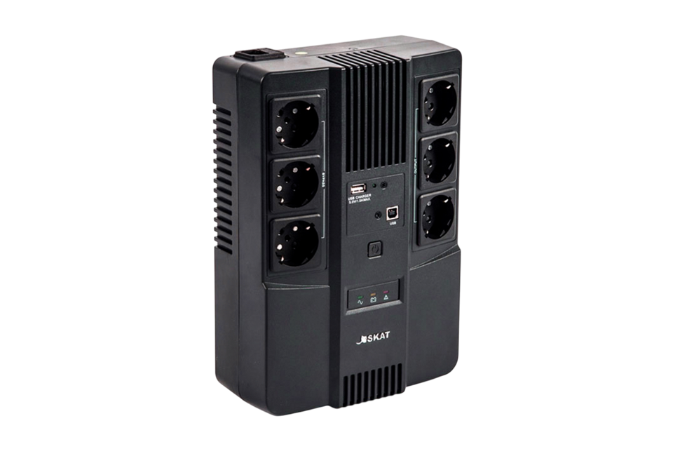 452 SKAT-UPS 800 AI ИБП 800 ВА/480 Вт, Диапазон входного напряжения: 170 — 270 В 1АКБ 9Ач внутр. меандр. стаб-ция напр-я., Выходные разъёмы: Schuko – 3 шт. (с питание от АКБ), Schuko – 3 шт. (фильтрация)