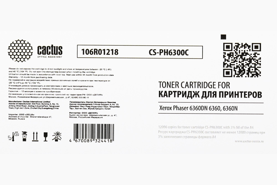 Картридж лазерный Cactus CS-PH6300C 106R01218 голубой (12000стр.) для Xerox Phaser 6360DN 6360, 6360N