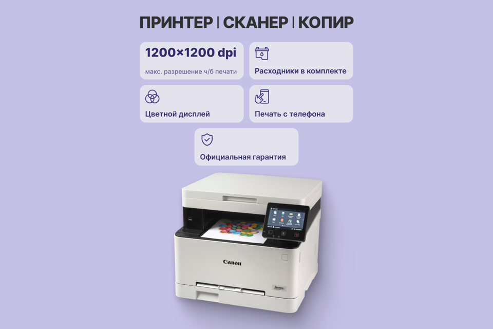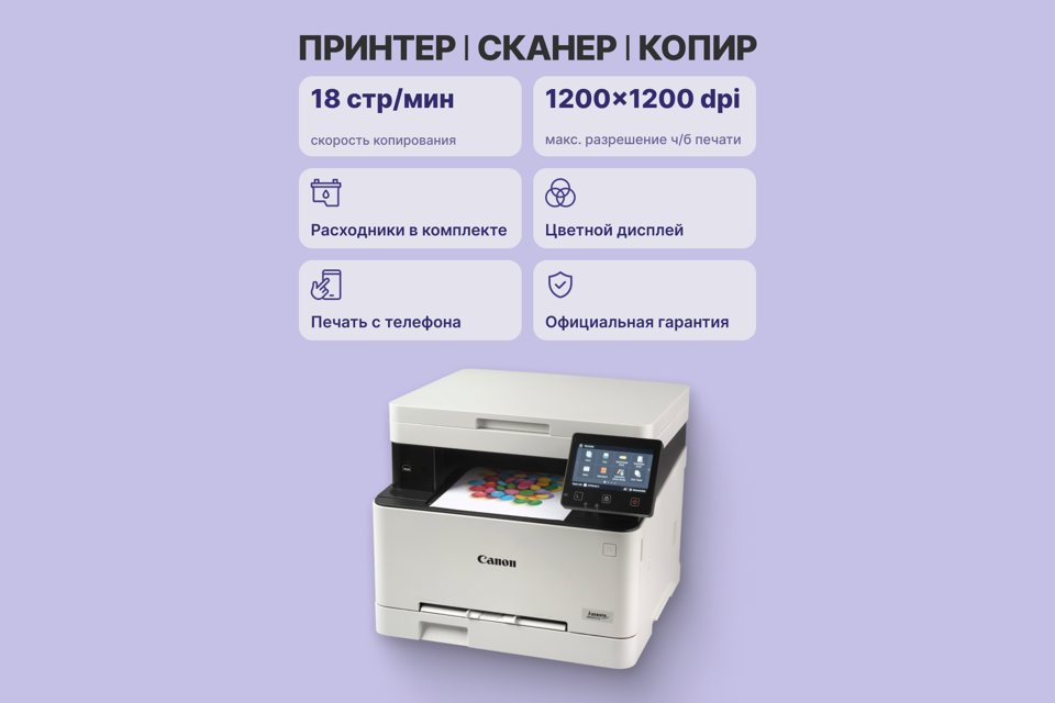 В комплект поставки принтера входят стартовые картриджи: черный — 1350 стр., (C/M/Y) — 680 стр.