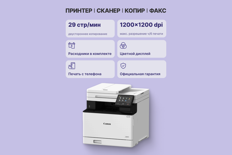 МФУ, комплект документации, 4 стартовых картриджа (1 черный, 1 голубой, 1 пурпурный, 1 желтый), кабель питания (опция), кабель USB (опция), диск с ПО (опция)