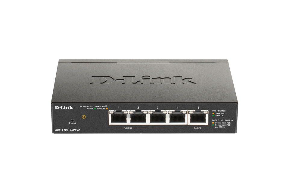 Коммутатор D-Link DGS-1100-05PDV2/A1A Настраиваемый L2 коммутатор с 5 портами 10/100/1000Base-T (2 порта PoE 802.3af, PoE-бюджет 18 Вт (802.3at) или 8 Вт (802.3af), 1 порт для питания коммутатора по PoE) DGS-1100-05PDV2/A1A (453298)
