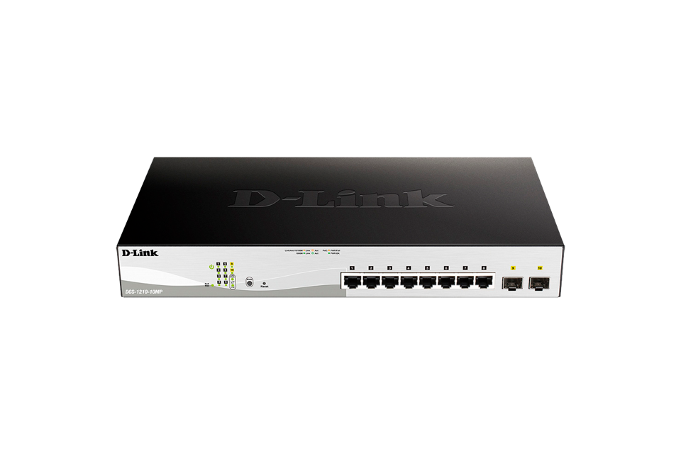 Коммутатор D-Link DGS-1210-10MP/F1A Настраиваемый коммутатор WebSmart с 8 портами 10/100/1000Base-T и 2 портами 1000Base-X SFP (8 портов с поддержкой PoE 802.3af/802.3at (30 Вт), PoE-бюджет 130 Вт), RTL {3} (432507)