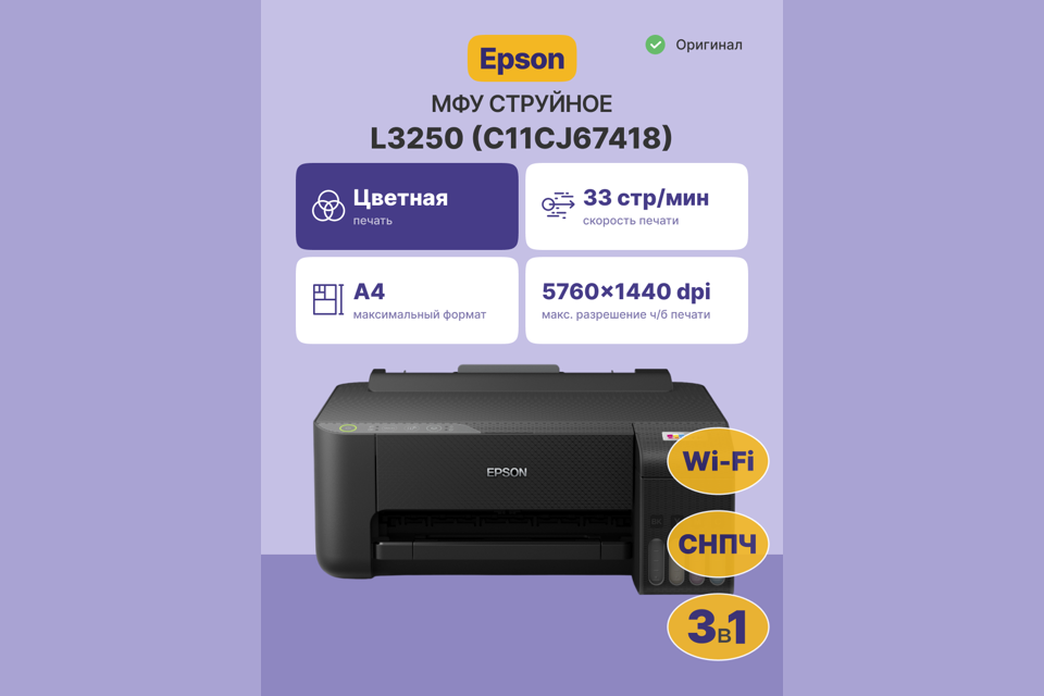 Epson L3250 A4, МФУ, струйное, цветное, 30стр/мин, 5760x1440dpi, 100АПД, USB/WIFI, СНПЧ (C11CJ67405/C11CJ67418/C11CJ67412/C11CJ67503)