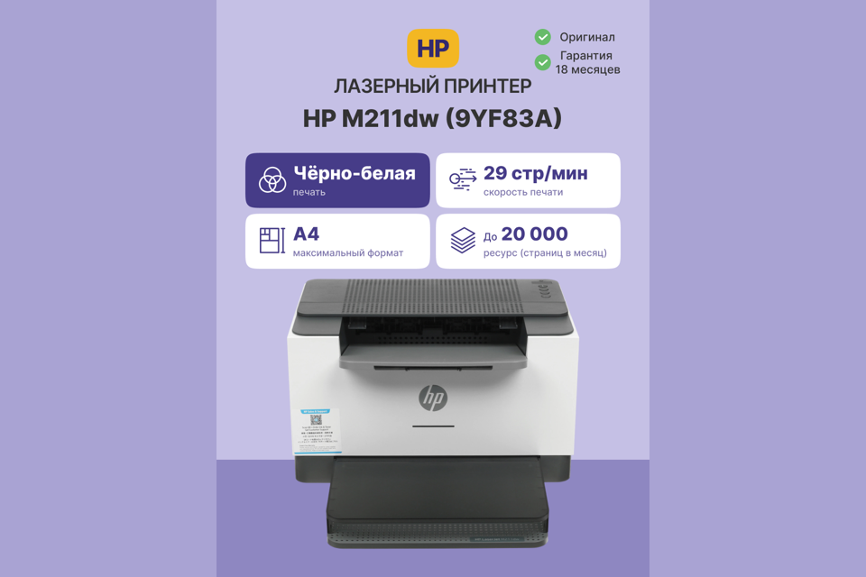 Принтер HP LaserJet M211dw A4, лазерный, черно-белый, 29стр/мин, 600dpi, 500МГц, 64Мб, WiFi/AirPrint/USB/Ethernet , 700стр/картридж, (9YF83A)(668432)