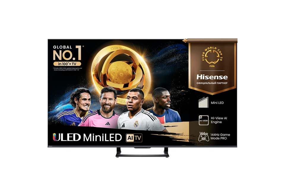 Телевизор ЖК 65'' Hisense/ 55", Ultra HD, Mini LED, Local Dimming Zones 220, 144 Hz(VRR), Smart TV (ОС VIDAA U8.5), Wi-Fi, DVB-T2/T/C/S2/S, HDR 10+, Dolby Vision, Dolby Atmos, Bluetooth, 2.1ch 2*10W(Main)+20W(Subwoofer), CI+(1.4), 4хHDMI, 2хUSB, FreeSync Premium , 144Hz Game Mode Pro, Black, Central Stand, 2025