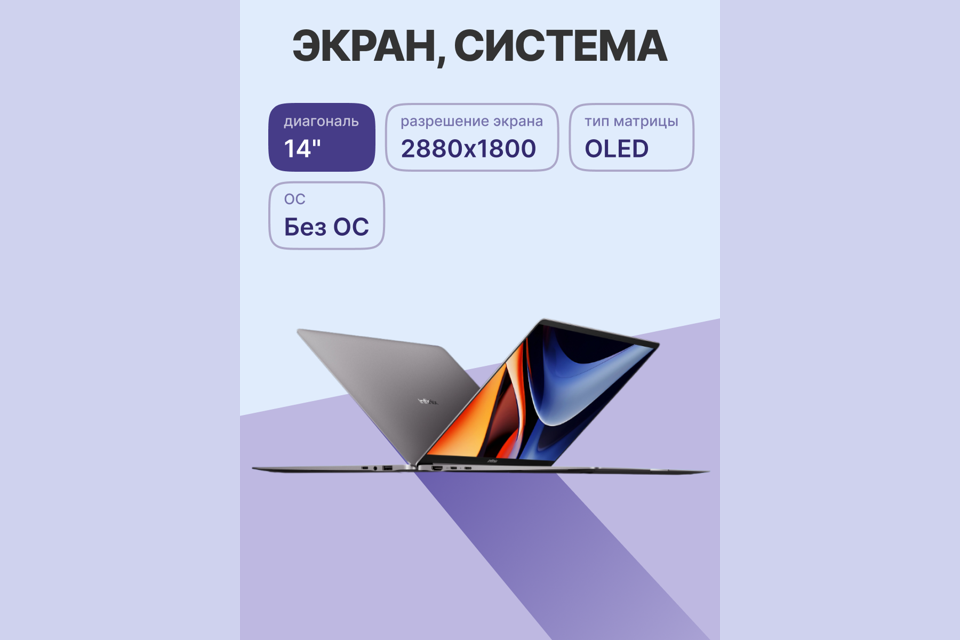 14", QWXGA+ (2880х1800), OLED, 120 Гц, 440 нит, время отклика 0.5 мс, матовое покрытие, угол обзора 178°