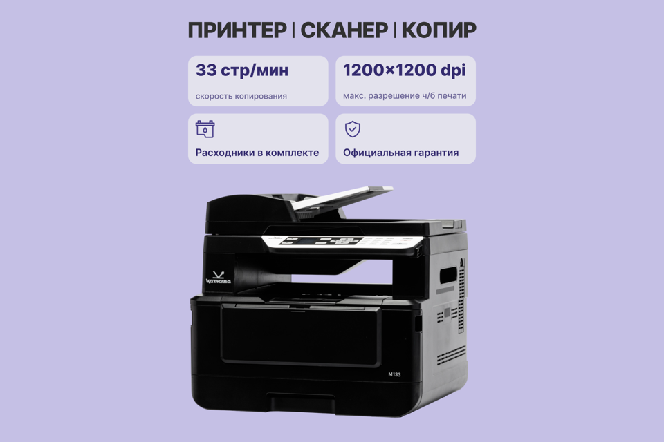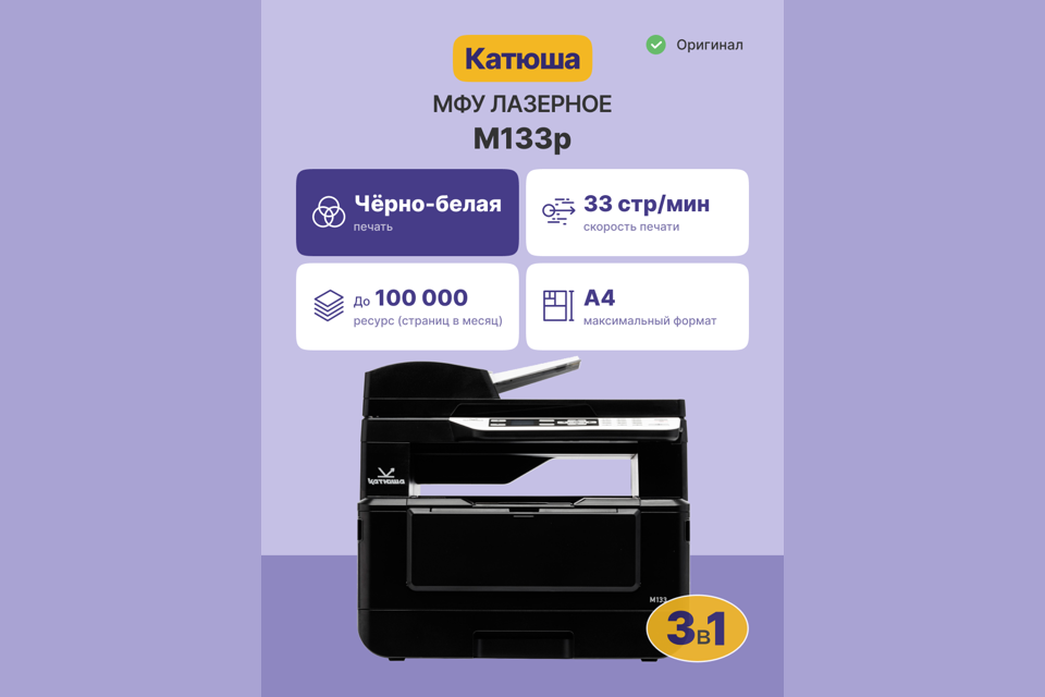МФУ Катюша M133p принтер/копир/сканер, 33 стр/мин А4 Ч/Б, 1200 dpi. CPU 350 МГц, 1Гб RAM, Ethernet, USB, USB-host, Wi-Fi (опция). ADF 35 листов. Тонер 700 отп, заменяемый тонер 3 000 отп. До 100 000 отп/мес.
