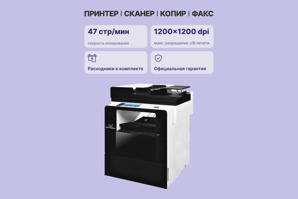 МФУ Катюша M247e принтер/копир/сканер/факс. 47 стр/мин А4+ Ч/Б печать, 1200 dpi. Сканер цвет А4-А3 до 60 стр/мин. CPU 1 ГГц, 2 ГБ RAM, Ethernet, USB, USB-host, Wi-Fi. PS3, PCL, PDF, GDI. DF 50 листов. 6" панель управления + клавиатура. Тонер 3 000 отп., заменяемый 6 000/13 000 отп. До 200 000 отп/мес.