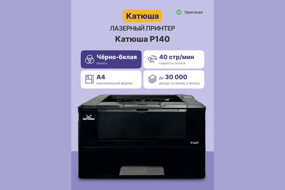 Принтер Принтер Катюша P140, 40 стр/мин А4 Ч/Б, Ethernet, USB, Wi-Fi (опция). Тонер в комплекте на 3000 отп