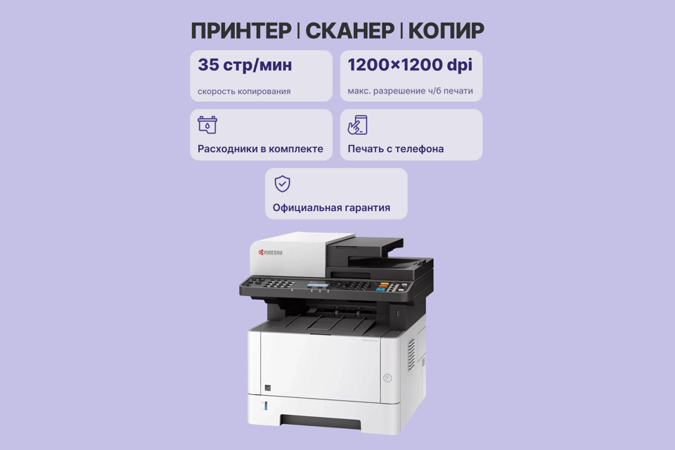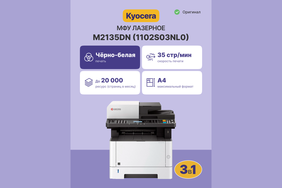 МФУ лазерное Kyocera ECOSYS M2135dn (A4), монохромное, Printer/Scanner/Copier, 1200x1200 dpi, 35 ppm, 512 MB, 800 MHz, tray 100+250 sheets, ADF 50 sheets, USB+Ethernet, Duplex, EcoPrint, drum 100k, starter toner 1k