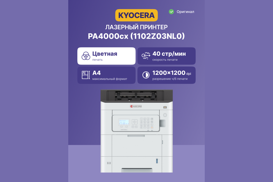 Принтер лазерный Kyocera ECOSYS PA4000cx (A4), цветной, 1200x1200 dpi, 40 ppm, 1 GB, 1.2 GHz, tray 100+500 sheets, USB+Ethernet, Duplex, LCD, drum 200k, starter toner
