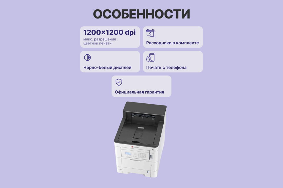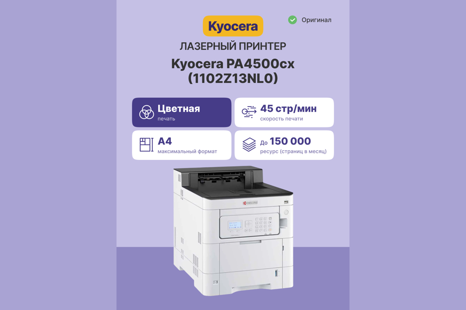 Принтер лазерный Kyocera ECOSYS PA4500cx (A4), цветной, 1200x1200 dpi, 45 ppm, 1 GB, 1.2 GHz, tray 100+500 sheets, USB+Ethernet, Duplex, LCD, drum 200k, starter toner)