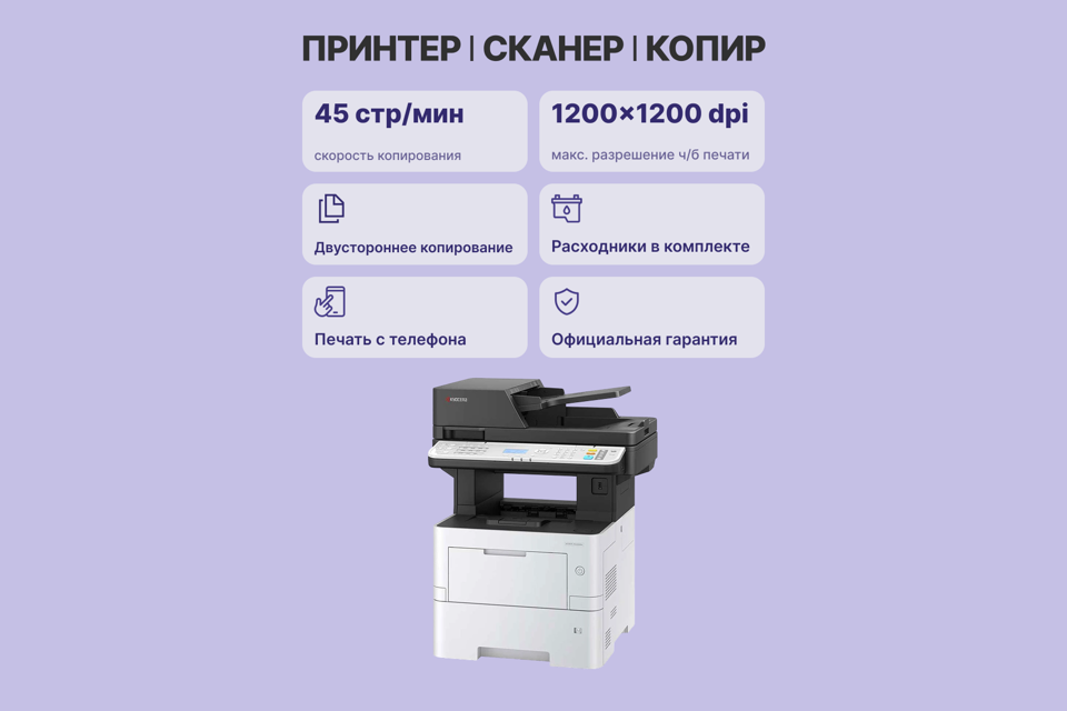Односторонняя печать — до 45 стр/мин двухсторонняя — до 22.5 стр/мин