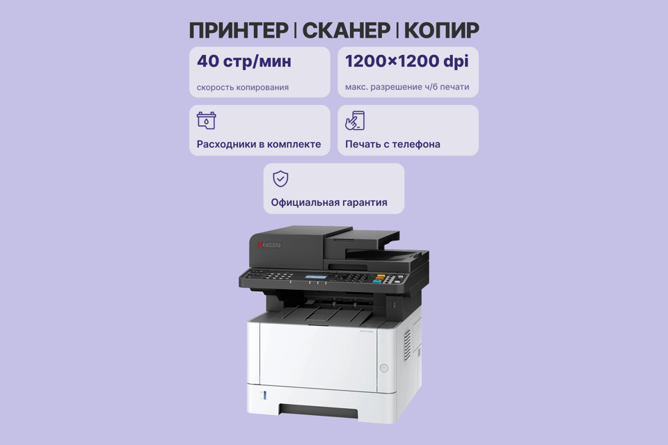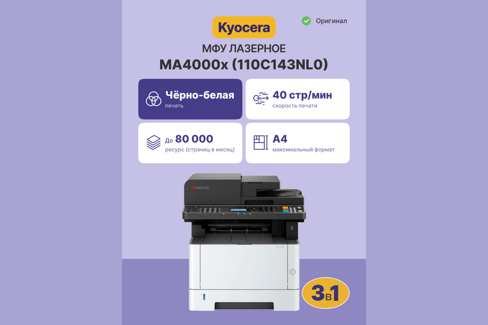 МФУ лазерное Kyocera Ecosys MA4000x А4, черно-белая печать, 40 стр/мин, 1200х1200dpi, 1024 МГц, 1024 Мб, 50АПД, 150+100, USB, стартовый картридж (ч/б) 3600 стр, белый корпус, (110C143NL0)