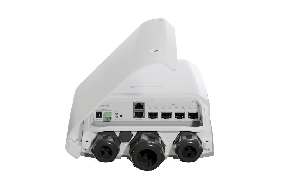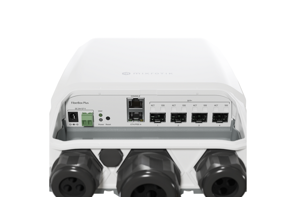 Коммутатор/ FiberBox Plus CRS305-1G-4S+OUT with 800MHz CPU, 256MB RAM, 1xGigabit LAN, 4 x SFP+ cages, RouterOS L5 or SwitchOS (dual boot), IP66 compliant outdoor enclosure, mounting kit, PSU, PoE injector