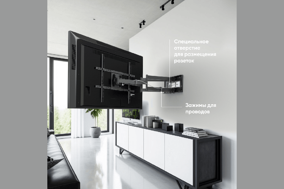 | Дополнительная информация | VESA: 300x100, 300x200, 300x400, 400x200, 400x300, 500x400, 600x200, 600x300, 600x600, 800x600. Угол наклона: -5°~+15°. Угол поворота: ±90°. Угол вращения: 0° ~ -90°. Вылет от стены: 103~1030 мм. Съемный уровень, шаблон разметки, анкеры в комплекте |