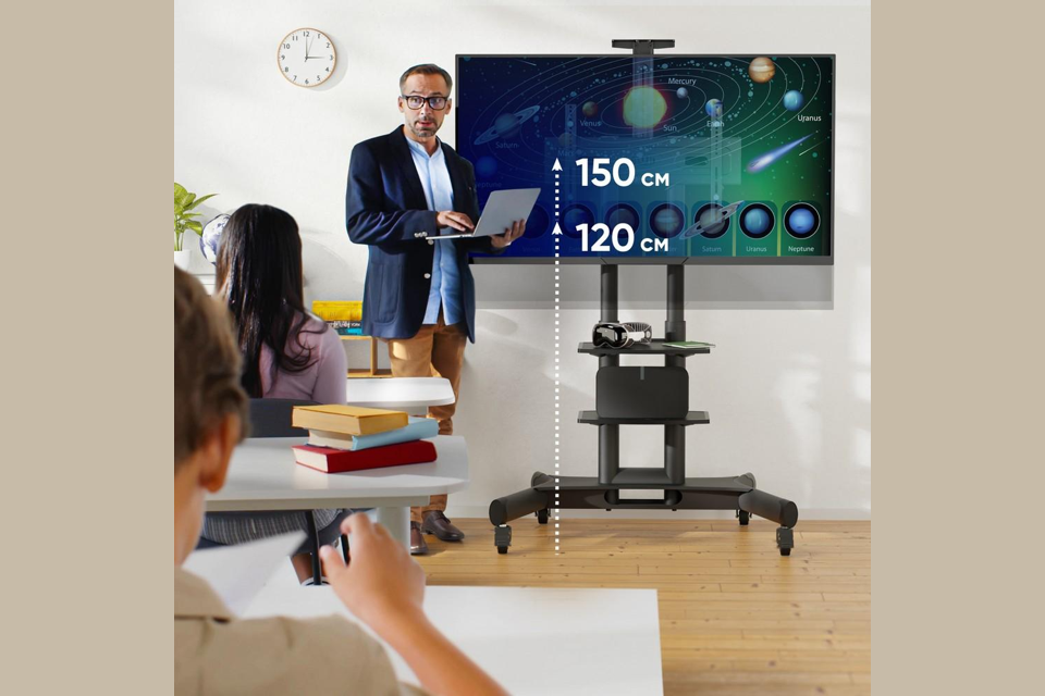 Мобильная стойка ONKRON на 1 ТВ/ 40-70" от 200х200 до 400х600 наклон 0? поворот 0? макс нагр 60,5кг Высота 1200-1500мм, кабель-канал, 2 полки, регулировка полок по высоте, колесики с блокировкой, черная