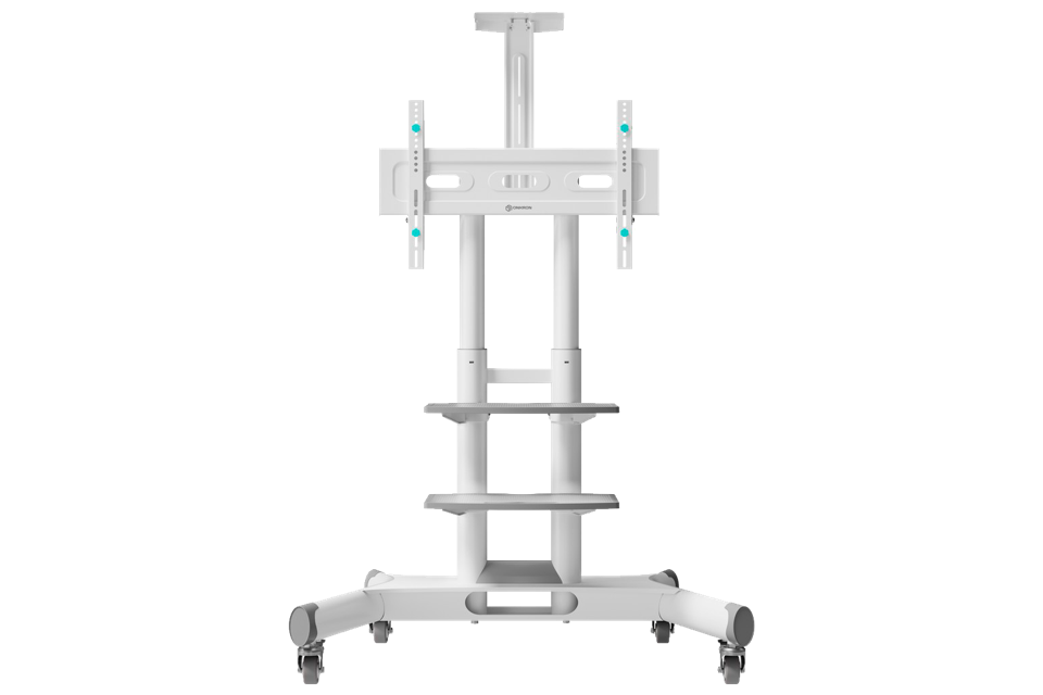 Мобильная стойка ONKRON на 1 ТВ/ 40-70" от 200х200 до 400х600 наклон 0? поворот 0? макс нагр 60,5кг Высота 1200-1500мм, кабель-канал, 2 полки, регулировка полок по высоте, колесики с блокировкой, белая