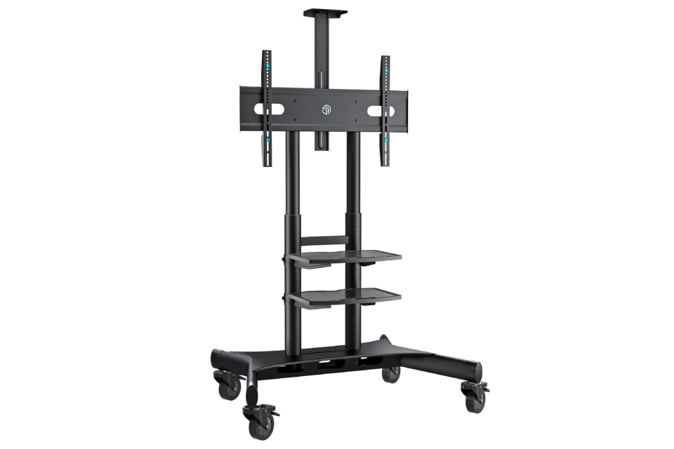 Мобильная стойка ONKRON на 1 ТВ/ 50-86" от 300х100 до 800х500, макс нагр 90,9кг, 2 полки, высота 1350-1650мм, черный