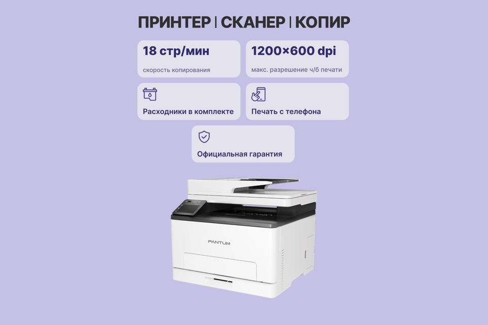 МФУ, комплект документации, гарантийный талон, картриджи (голубой, пурпурный, желтый, черный), кабель питания, кабель USB, диск с ПО