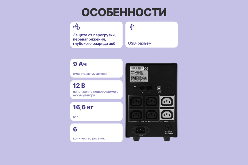 ИБП, входной кабель питания, два выходных кабеля питания, телефонный кабель, USB-кабель, диск с ПО, инструкция