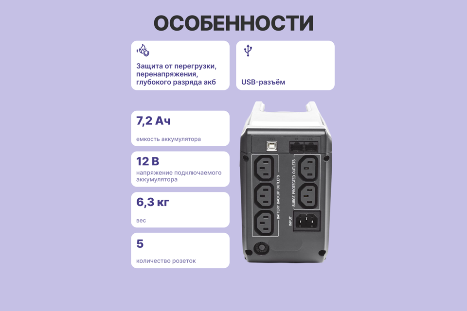ИБП, входной кабель питания, два выходных кабеля питания, телефонный кабель, USB-кабель, диск с ПО, инструкция