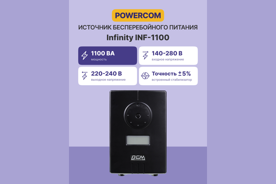 Источник бесперебойного питания Powercom Infinity, Line-Interactive, 1100VA/750W, Tower, Schuko, USB, подкл. доп. Батарей (383441)