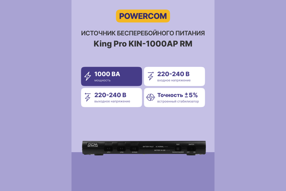 Источник бесперебойного питания Powercom King Pro RM, Line-Interactive, 1000VA/800W, Rack mount 1U, 5*IEC320-C13 (1 surge & 4 batt), USB, LCD, black (1152593)