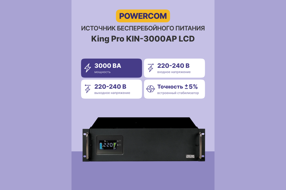 Источник бесперебойного питания Powercom King Pro RM, Line-Interactive, 3000VA/2400W, Rack mount 3U, 8*IEC320-C13 (8 batt), Serial+USB, SmartSlot, LCD, black (1152615) (царапины, мелкая вмятина)