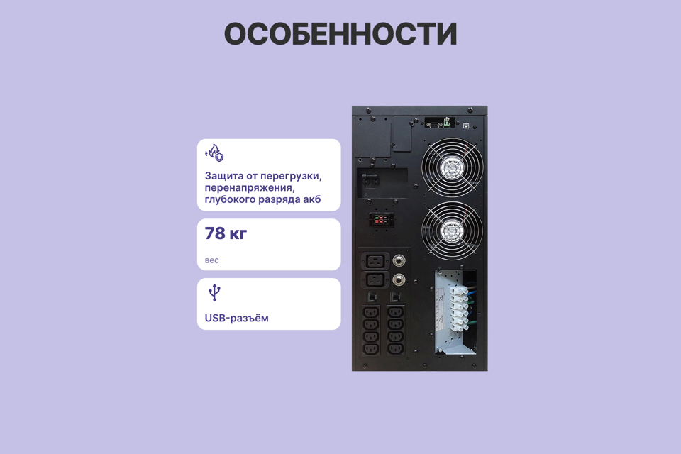 | Дополнительная информация | Выходные разъемы: Клеммная колодка и розетки IEC320 8 x C13, 2 x C19; SNMP: Встроенный слот расширения для SNMP адаптера; Подключение дополнительных батарей; Холодный старт; Защита АКБ: Автоматическая диагностика, защита от переразряда и короткого замыкания |