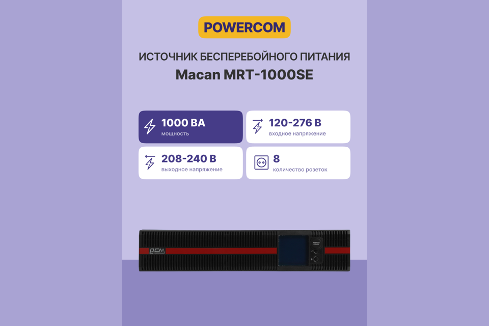 Источник бесперебойного питания Powercom MACAN SE, On-Line, 1000VA/1000W, Rack/Tower, 8*IEC320-C13, LCD, Serial+USB, SmartSlot, подкл. доп. Батарей (1076118)