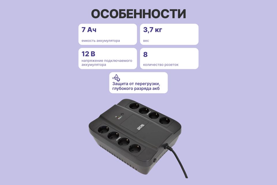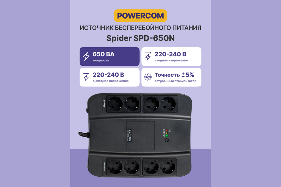 ИБП SPD-650N, резервный, 650 ВA, 390 Вт, 4 евророзетки с резервным питанием, 4 евророзетки с фильтрацией, ШхГхВ 285х232х103мм, 3.7 кг/ Powercom UPS Spider SPD-650N