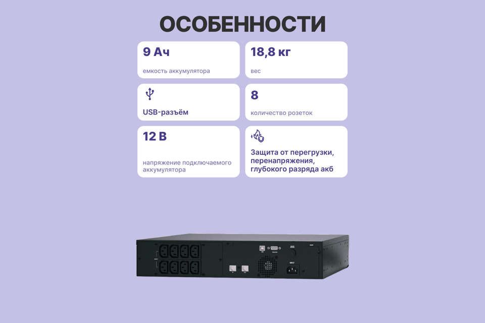 ИБП, документация, кабель питания, кабель для нагрузки, телефонный кабель, кабель USB, диск с ПО, съемные ножки, крепеж для серверного шкафа