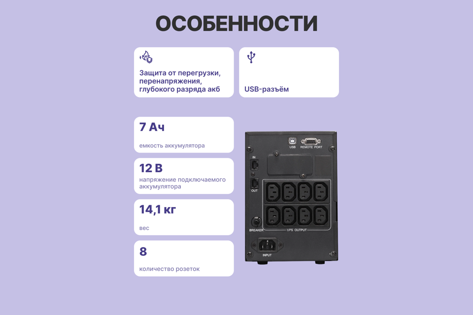 ИБП, документация, гарантийный талон, кабель USB, телефонный кабель, диск с ПО, кабель питания, кабель для нагрузки