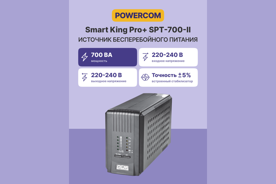 Источник бесперебойного питания Powercom Smart King Pro+ SPT-700, Line-Interactive, 700VA/560W, Tower, 5*IEC320-C13 (2 surge & 3 batt), black (1154033)