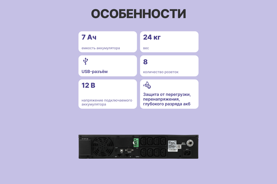 ИБП, документация, гар.талон, кабель USB/RS232, телеф.кабель, диск с ПО, кабель питания, комплект ножек, комплект для установки в серв.стойку