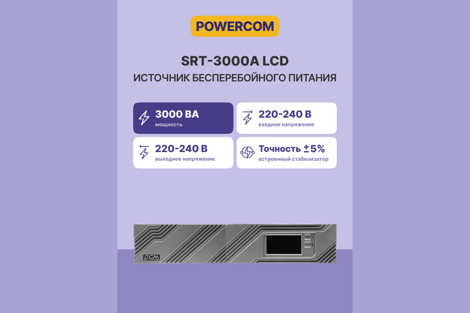 ИБП SRT-3000A, линейно-интерактивный, 3000ВА, 2700Вт, LCD, Rack/Tower, 8 розеток IEC320 C13 и 1 розетка C19 с резервным питанием, USB, RS-232, слот под SNMP карту, EPO, защита RJ45, ШхГхВ 428х669х84мм., вес 36.8кг./ UPS POWERCOM SRT-3000A, line-interactive, 3000VA, 2700W, LCD, Rack / Tower, 8 IEC320 C13 sockets and 1 C19 sockets with redundant power supply, USB, RS-232, SNMP card slot, EPO, RJ45 protection, WxDxH 428x669x84mm. , weight 36.8kg.