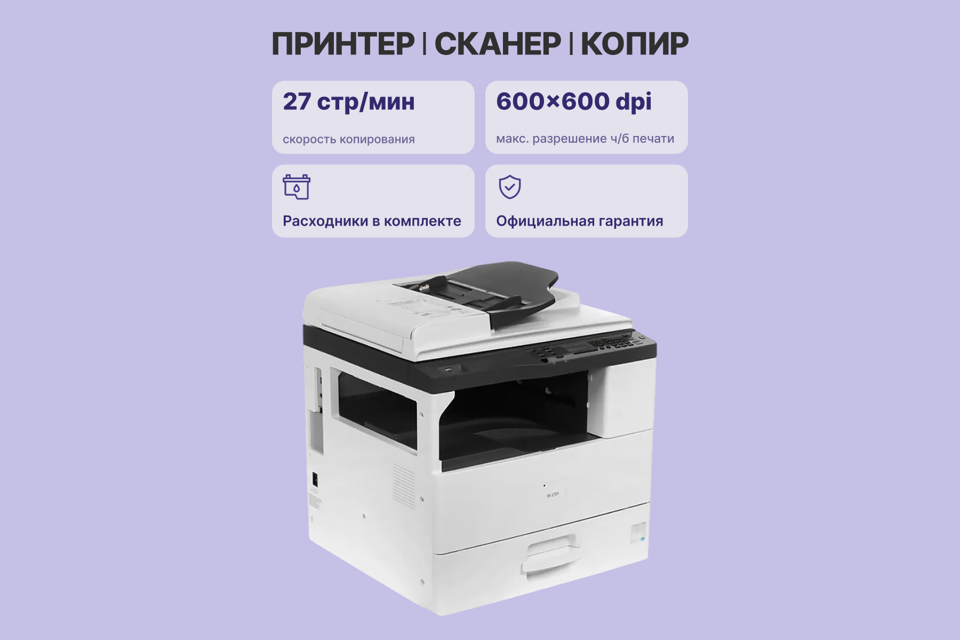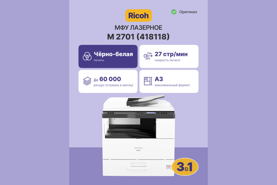 Мфу лазерное МФУ Ricoh M 2701 P/S/C ч/б A3 27 стр./мин., 600 dpi, AПД, с дуплексом, лоток 500 листов, девелопер (60К отп.), тонер на 9000 отп., запуск платно инженером!