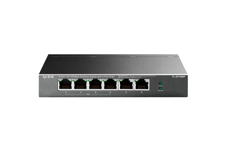 Коммутатор TP-LINK TL-SF1006P 4-портовый 10/100 Мбит/с неуправляемый коммутатор PoE+ с 2 Uplink-портами 10/100 Мбит/с, металлический корпус, настольная установка, 4 порта PoE+ стандарта 802.3af/at, 2 Uplink-порта 10/100 Мбит/с, (030933)