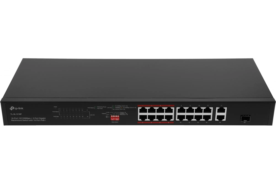 Коммутатор TP-LINK TL-SL1218P 16-портовый 10/100Мбит PoE+ коммутатор, 16 портов RJ45 10/100 Мбит/с + 1 независимый гигабитный RJ45 порт + 1 гигабитный комбинированный RJ45/SFP-слот, поддержка 802.3at/af, до 150 Ватт питание по PoE, 19- дюймовый монтируемый в стойку {6} (0